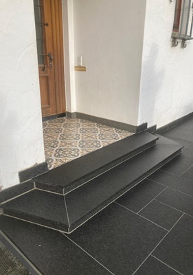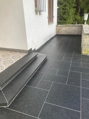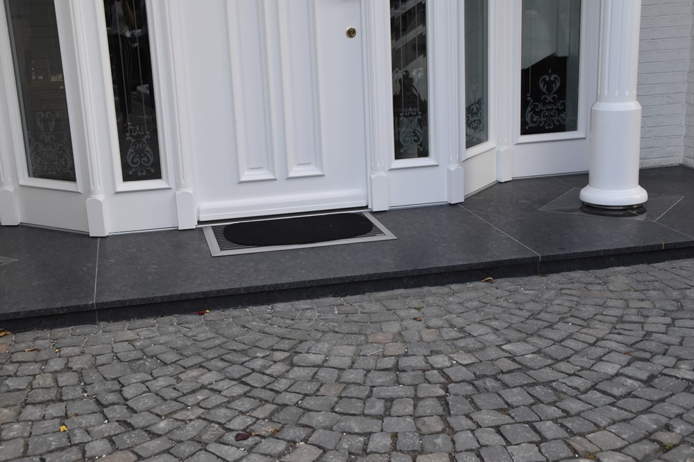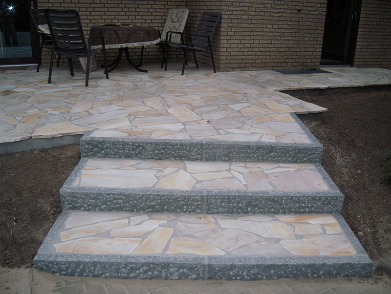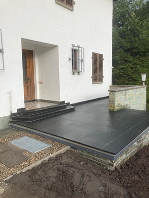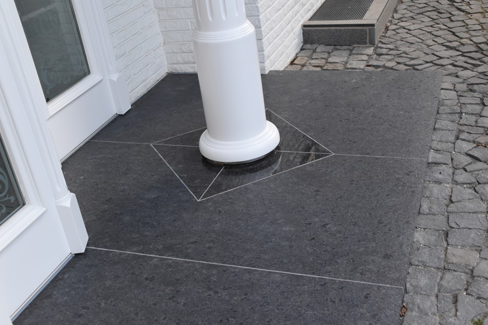 Als Bodenbelag im Außenbereich hat sich Naturstein bewährt. Besonders Hauseingänge und Treppen lassen sich mit ihm wunderbar gestalten.